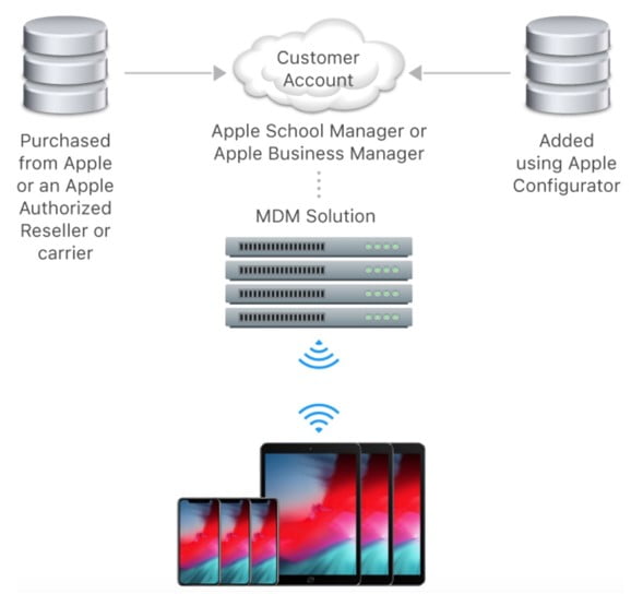 Apple Business Manager te permite registrar automáticamente dispositivos iOS y macOS de propiedad corporativa en tu solución favorita de administración de dispositivos móviles (MDM / Mobile Device Management) para que puedan configurarse inmediatamente con las configuraciones de la cuenta, aplicaciones y acceso a servicios corporativos.